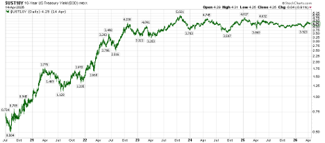 The first is the 10-year U.S. Treasury Yield.  After surging from 0.5% in the wake of the COVID outbreak in 2020, it has been rangebound between 3.5% and 5.0% for the last three years since 2023 (higher bond yields, lower bond prices).  If the 10-Year U.S. Treasury yield finds itself jumping sustainably above 5%, this is not a good sign.  Today, we are at a comfortable 4.25% right smack dab in the middle of the range, so nothing to worry about right now.  But just as the S&P 500 can make its way from 6316 to over 7000 in a figurative heartbeat, so too can Treasury yields move at a similar pace.