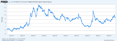 What have we been seeing recently?  SInce bottoming in early 2025, credit spreads have been steadily on the rise.  Focusing on CCC & Lower US High Yield Index spreads that historically have been the first to show signs of stress that eventually spread to the broader market, we have seen spreads widen from the lows just before 7% at the beginning of last year to above 10% for the first time since the Liberation Day tariff related spikes in spreads took place just over a year ago.  We’re currently at the high end of the neutral zone, but if spreads start moving sustainably above 10% or more, we should be prepared for this risk-off sentiment to spread to other more established market segments.