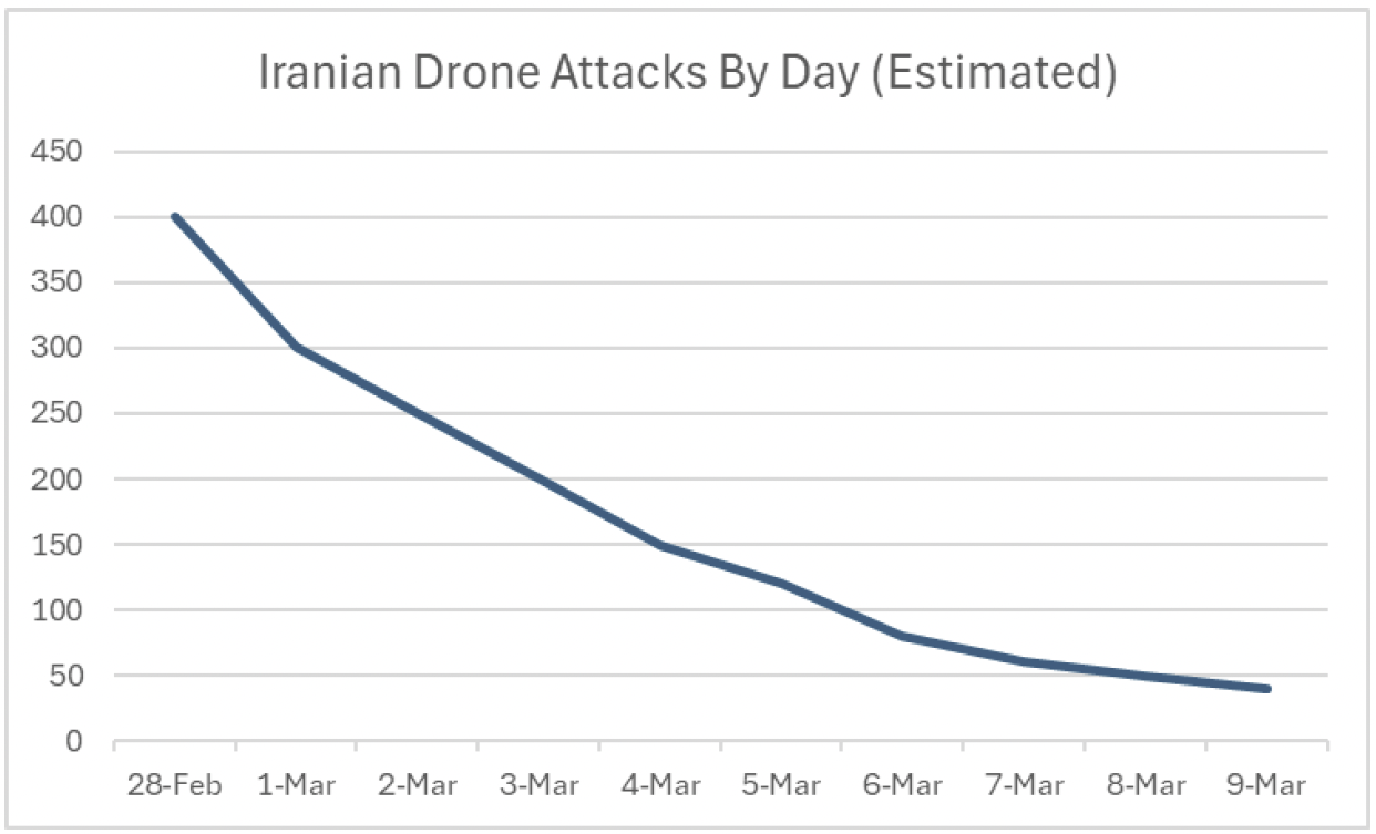 What about the drones? Pretty much the same story. Down an estimated -90% over the past ten days, but this is getting definitively weaker for Iran, not stronger.