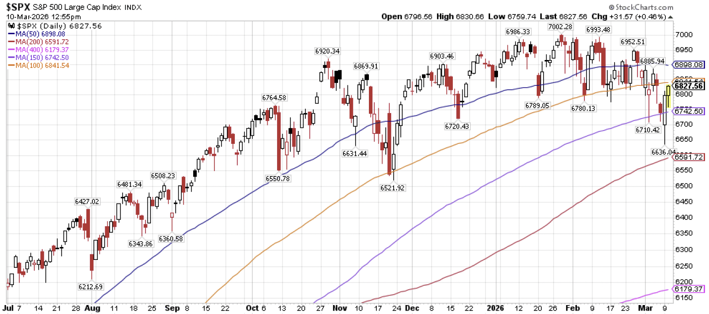 First, let’s draw back the lens and look at the broader, market cap weighted S&P 500 Index (which is made up of 33% information technology, 11% communications services, and 10% consumer discretionary (33+11+10 = 54, yikes)). First, it is actually notable how well the US stock market has held up amid all of the uncertainty caused by the Iran conflict. Overall, the S&P 500 is effectively flat since the market close on the Friday before the attacks on Iran began, having fallen by roughly -0.5%. What is more notable is the fact that the S&P 500 today is trading below its highs from late October 2025 more than four months ago. This suggests that stocks continue to work their way through what can best be described as uncertainty since late last year.