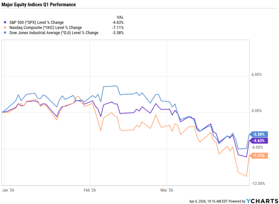 By March 31st, the S&P 500 had shed 4.63% for the quarter. The story of Q1 2026 isn’t simply one of a market that went down. It’s the story of two separate shocks that each, on their own, would have defined the quarter. Together, they redefined the outlook for the year.